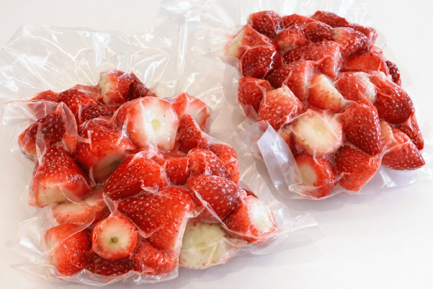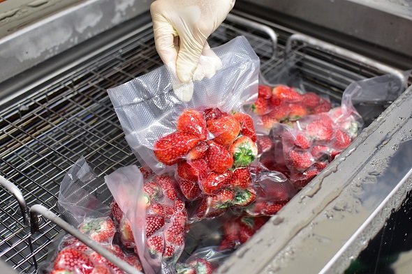 収穫をしたイチゴはその日のうちにヘタの部分をカット、真空パックしそのまま瞬間冷凍。
