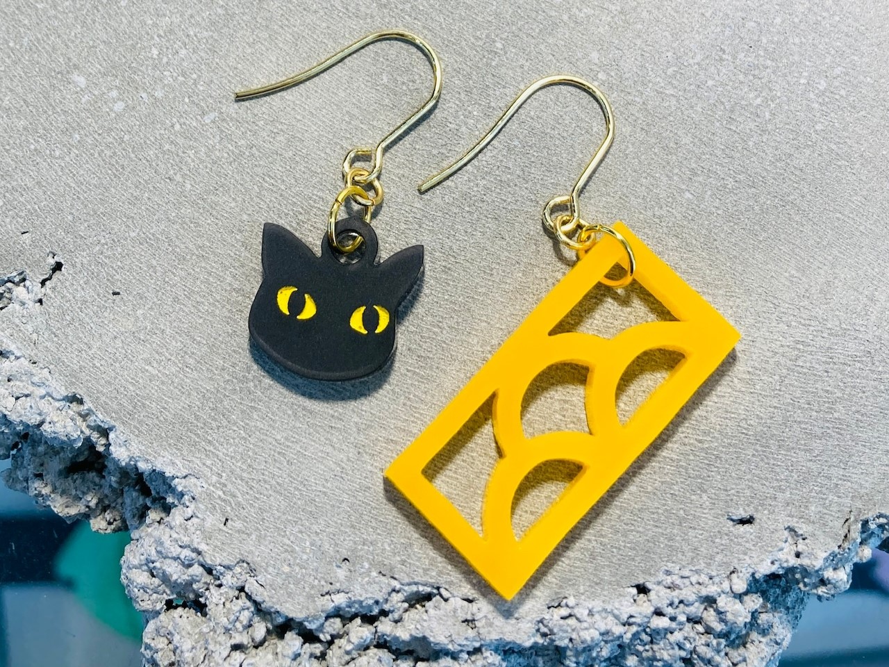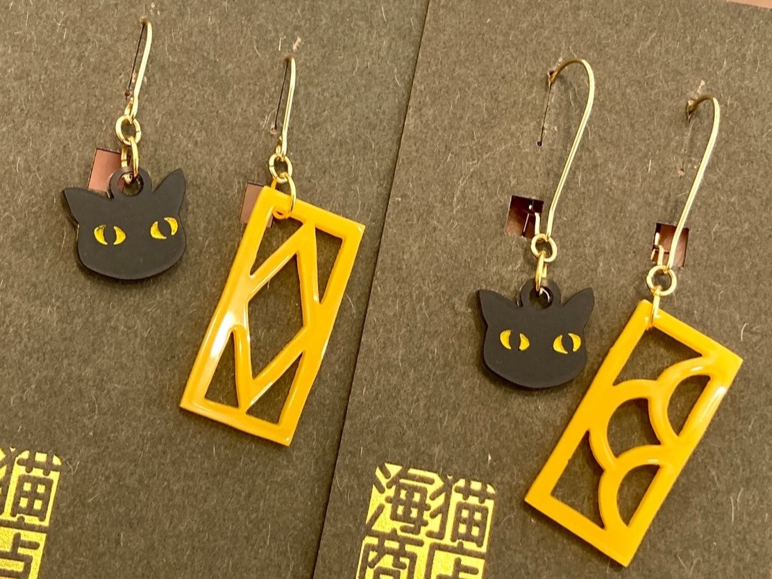 沖縄生まれのかわいい花ブロックと猫が、耳元でひらひらと揺れる可愛いピアスになりました。