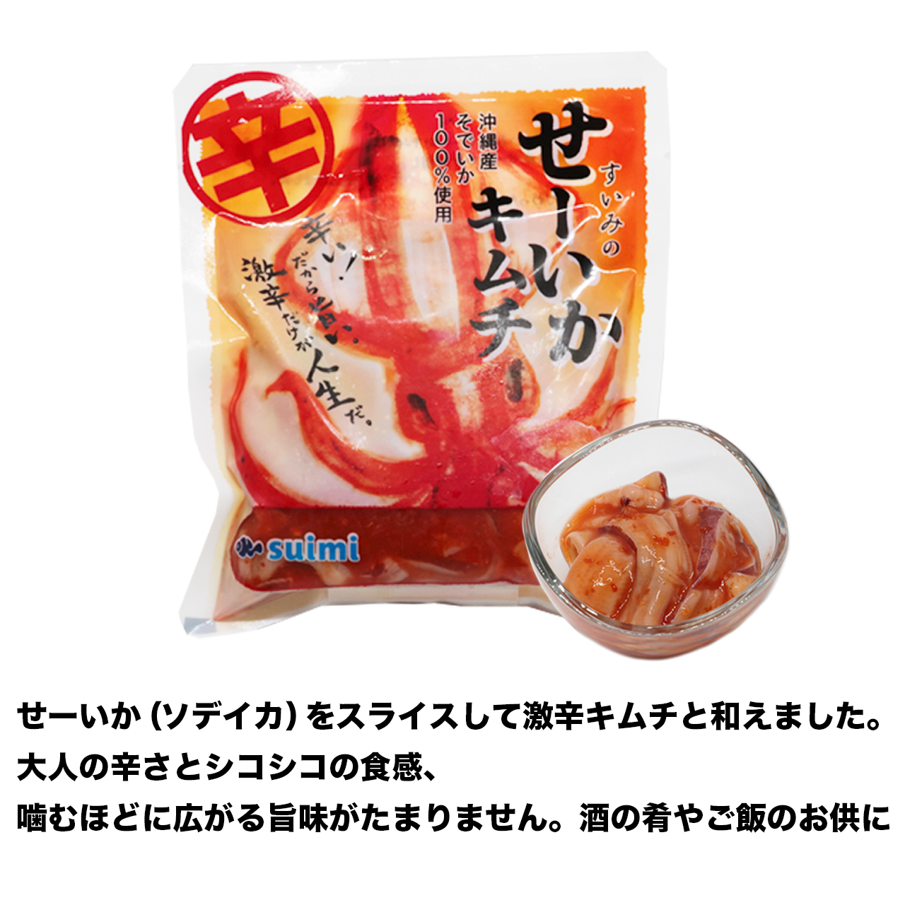 原材料:ソデイカ(沖縄産)、豆板醤、キムチ味液(食塩、ガーリック、砂糖、異性化液糖、その他)、発酵調味料、食塩、還元水飴、魚醤/調味料(アミノ酸等)、酒精、酸味料、増粘多糖類、パプリカ色素、(一部に大豆を含む)