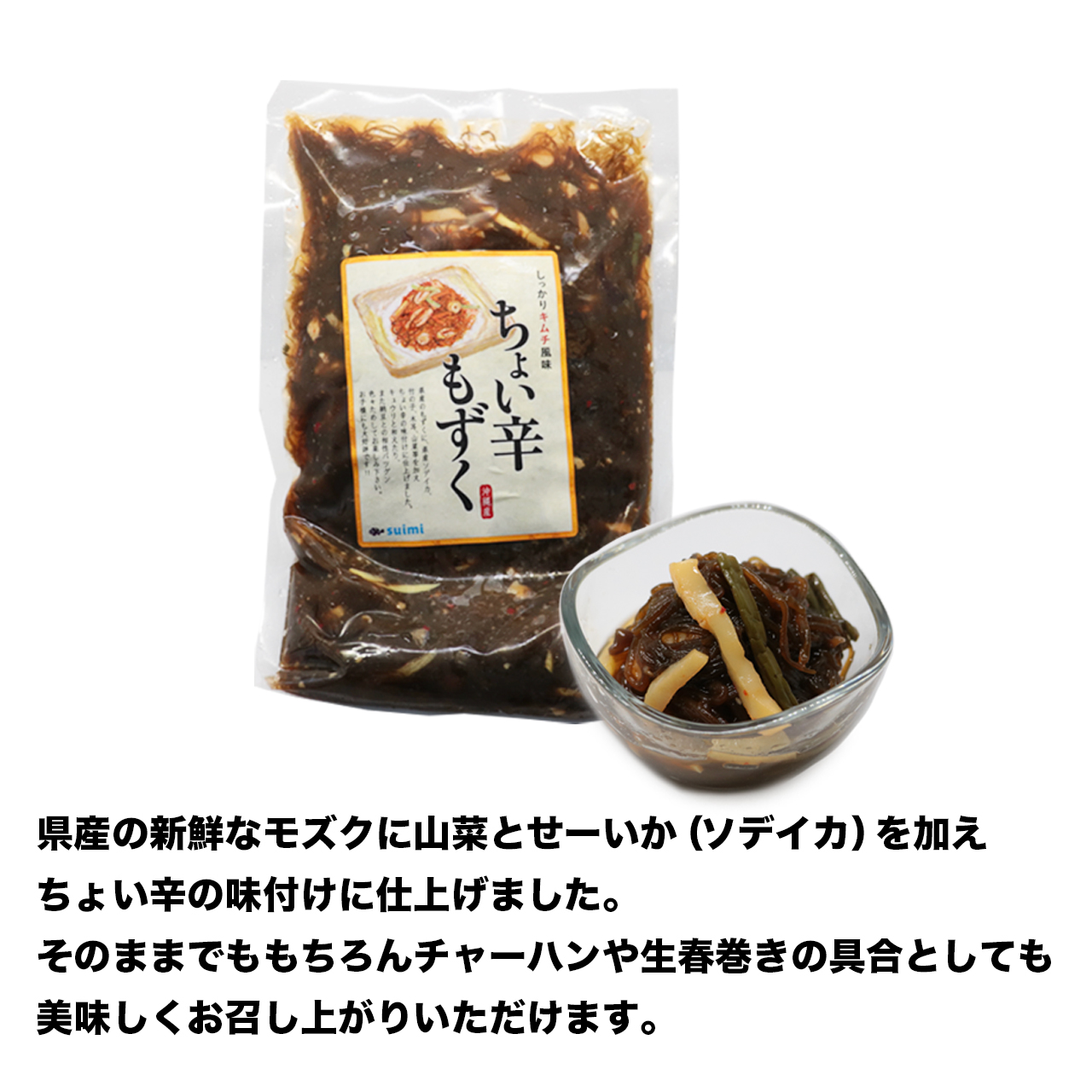 原材料:もずく(沖縄県産)、山菜ミックス(木耳、)、ぶどう糖果糖液糖、キムチ味液(食塩、ガーリック、砂糖、異性化液糖、その他)還元水飴、いか、醤油、発酵調味料、風味調味料、香辛料 / 調味料(アミノ酸等)、酸味料、保存料(しらこ、ソルビン酸K)着色料(パプリカ色素、銅葉緑素)増粘多糖類(キサンタンガム、カンプビーンガム)漂白剤(次亜硫酸Na)、(一部に大豆・小麦・イカを含む)