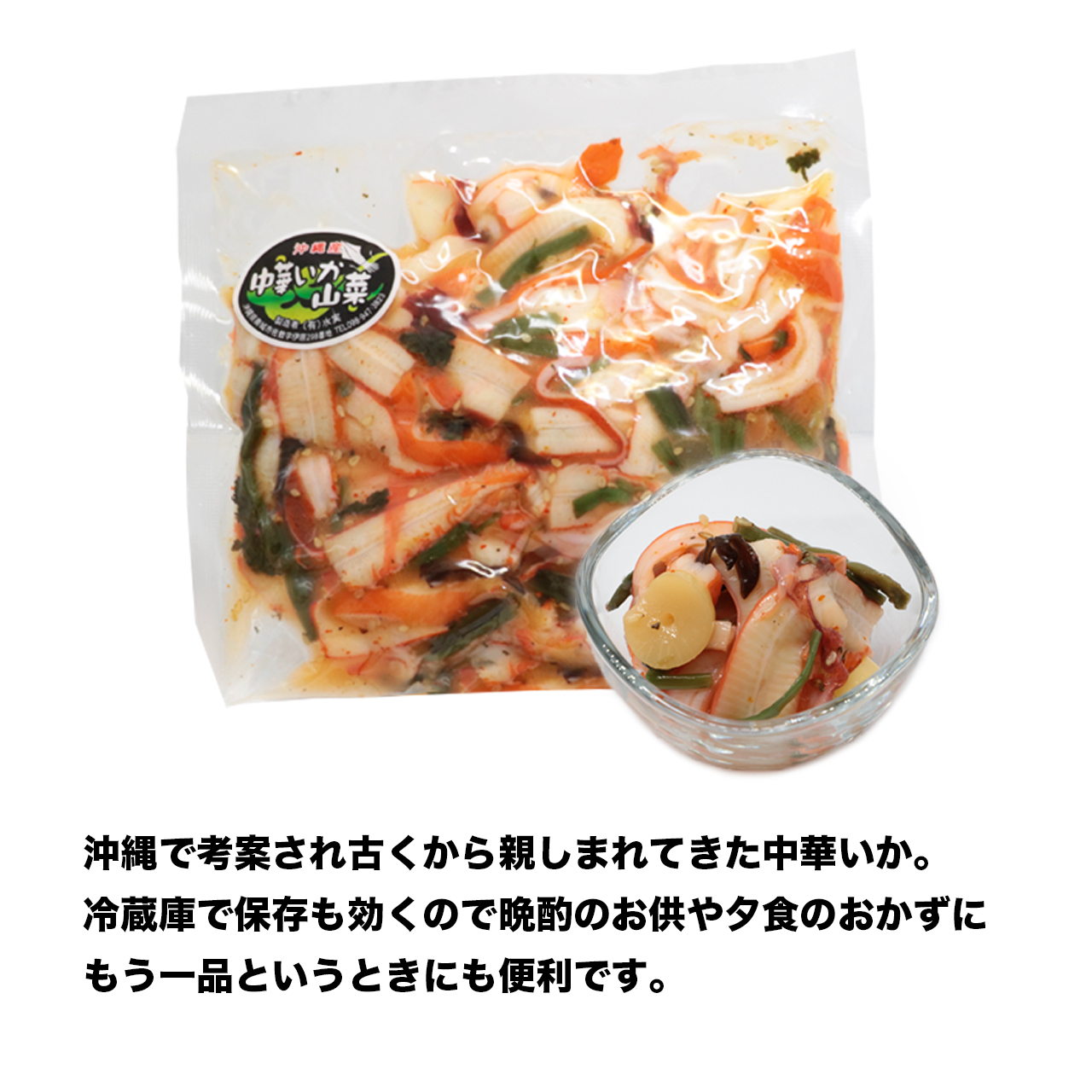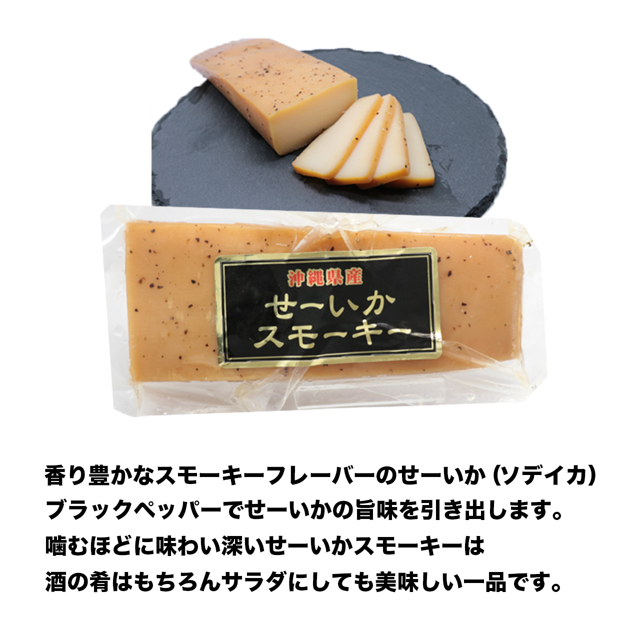 原材料:そでいか(沖縄県産)、グラニュー糖、食塩、醤油、にんにく、胡椒、唐辛子 / 調味料(アミノ酸等)、くん液、着色料(カラメル色素)、ph調整剤、(一部にいか・小麦・大豆を含む)