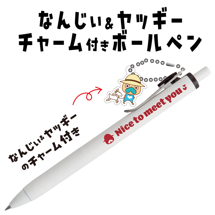 お土産にも配りやすい1色ボールペンで、なんじぃの相棒の白ヤギ“ヤッギー”と散歩中のかわいいチャームが付いています。