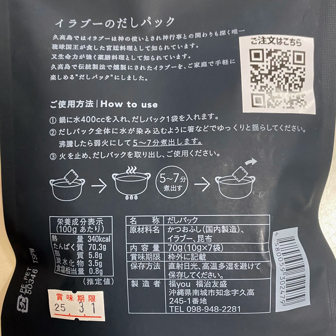 貴重な久高島のイラブーをご家庭で気軽に楽しめるだしパックです。だしを取るのはもちろん。そのままふりかけとしてお召し上がりになる方もいらっしゃいます。