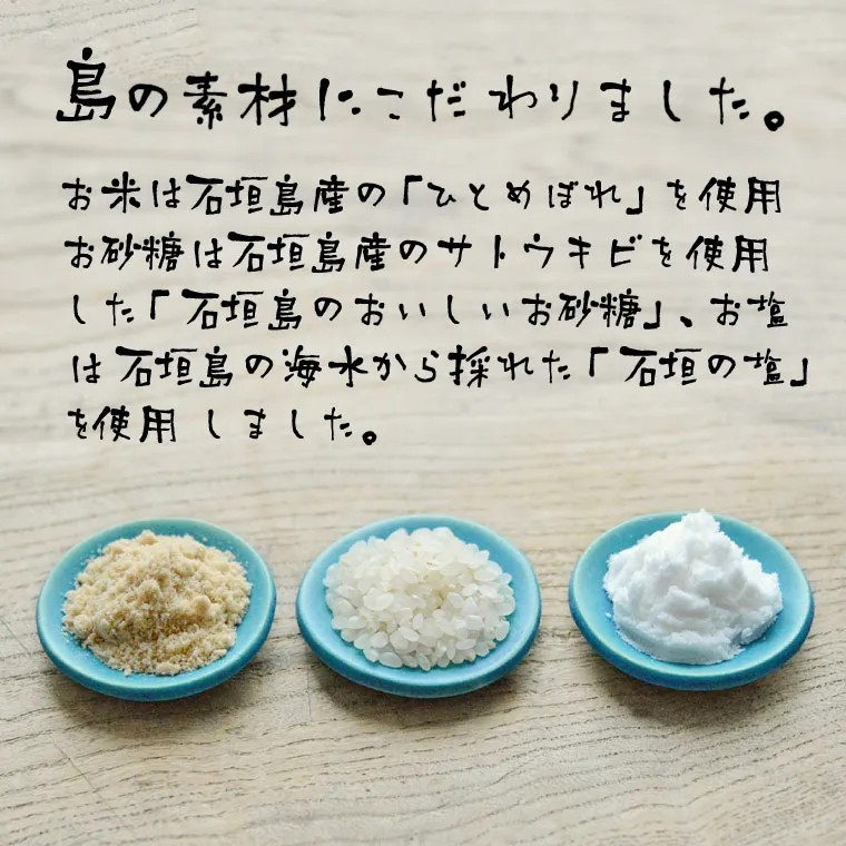お米は石垣島産の「ひとめぼれ」、お砂糖は100%石垣島産のさとうきびを使用した「石垣島のおいしいお砂糖」、お塩は美しい珊瑚礁が広がる石垣島名蔵湾の海水から採れた「石垣の塩」と、石垣島の素材にこだわりました。