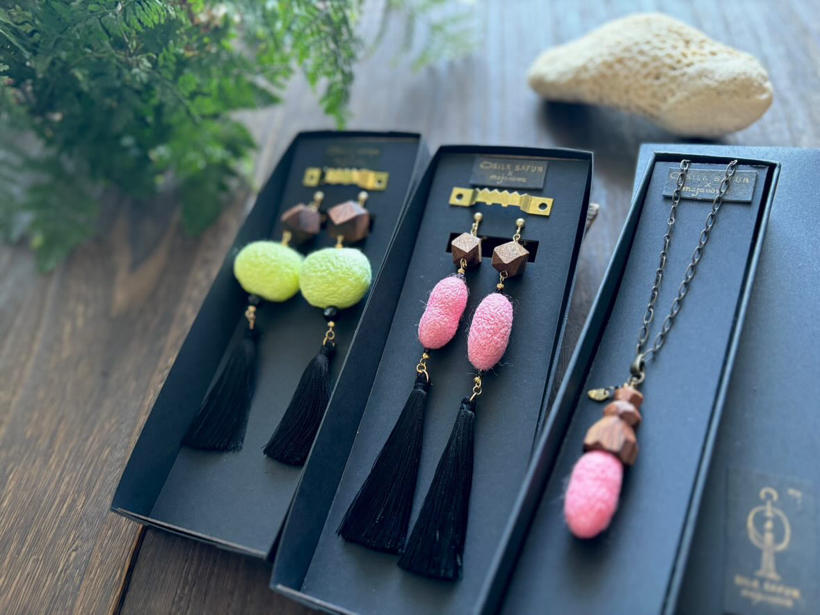 カイコ繭から生まれたシルクの美しさと、繊細な職人技を融合させたアクセサリー。