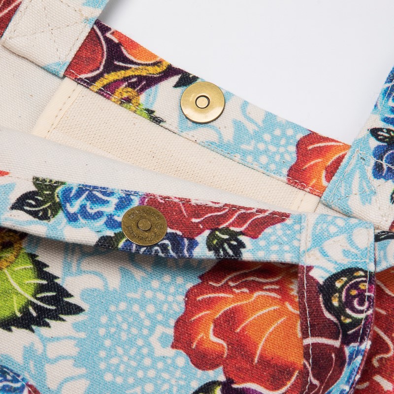 注目の若手紅型作家・新垣優香さんの個性豊かな絵柄をプリントした舟形トート。独特の「優香ワールド」を感じさせる人気の商品で、開口部はマグネット仕様となっています。マチが広いのでお弁当入れなどにも最適です。