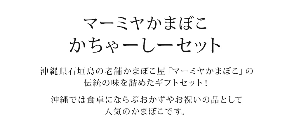 沖縄県石垣島の老舗かまぼこ屋がたどりついた沖縄かまぼこの代表的存在マーミヤかまぼこ。地元沖縄では日頃の食卓のにならぶおかずとして、またお祝いの品として人気のカマボコです。”かちゃーしーセット”はそんなマーミヤかまぼこの美味しいがいっぱい詰まった贈り物に最適なギフトセットとなっております。マーミヤかまぼこ人気の商品、棒天(マルグワァー) タラシ揚げ アーサ天 もずく天 にんにく天 ごぼう天を詰め合わせたセットとなっております。