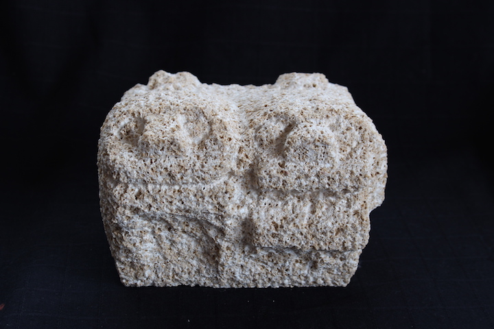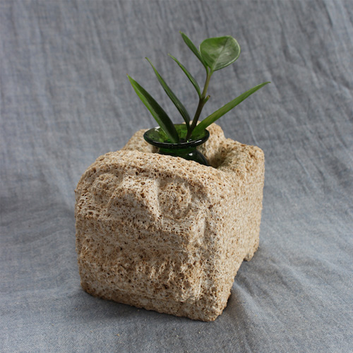 沖縄で採れる琉球石灰岩(栗石)を使ったこの石獅子は、スタジオde-jinの若山大地さんが手彫りしたもの。ころっとしたフォルムと、その愛らしい表情がなんとも言えません。