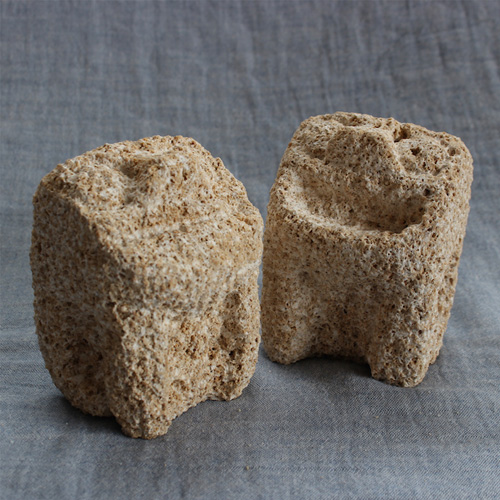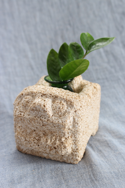 沖縄で採れる琉球石灰岩(栗石)を使ったこの石獅子は、スタジオde-jinの若山大地さんが手彫りしたもの。ころっとしたフォルムと、その愛らしい表情がなんとも言えません。