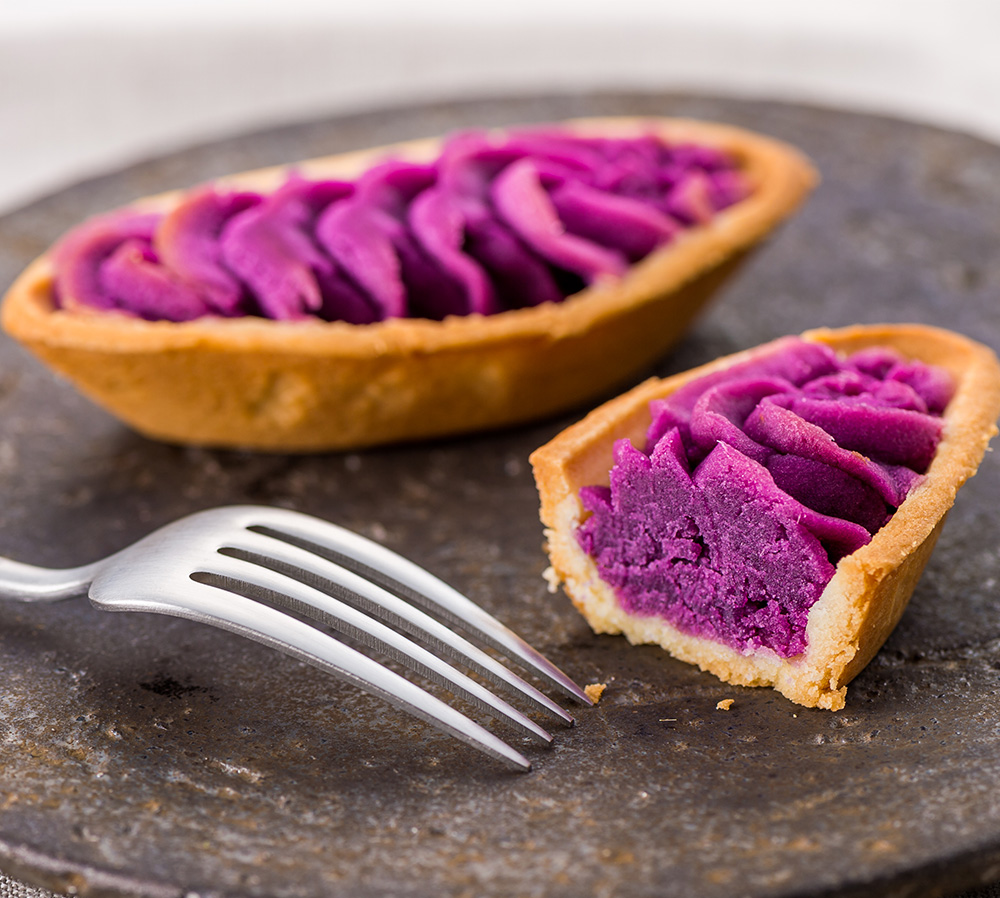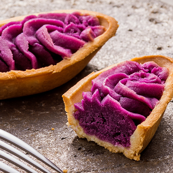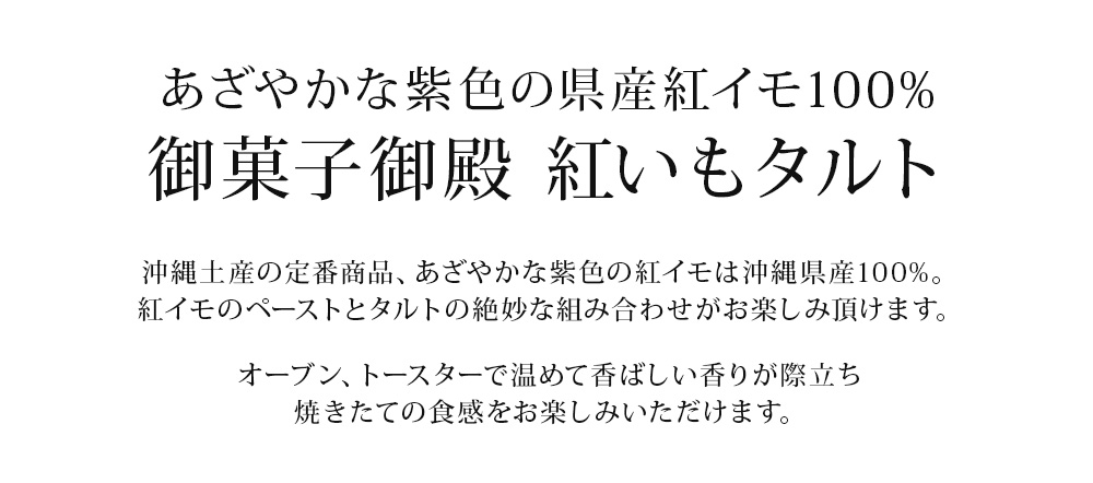 沖縄土産の定番商品。御菓子御殿の紅いもたると。あざやかな紫色の紅イモは沖縄県産100%。紅イモのペーストとタルトの絶妙な組み合わせがお楽しみ頂けます。オーブン、トースターで温めて香ばしい香りが際立ち焼きたての食感をお楽しみいただけます。