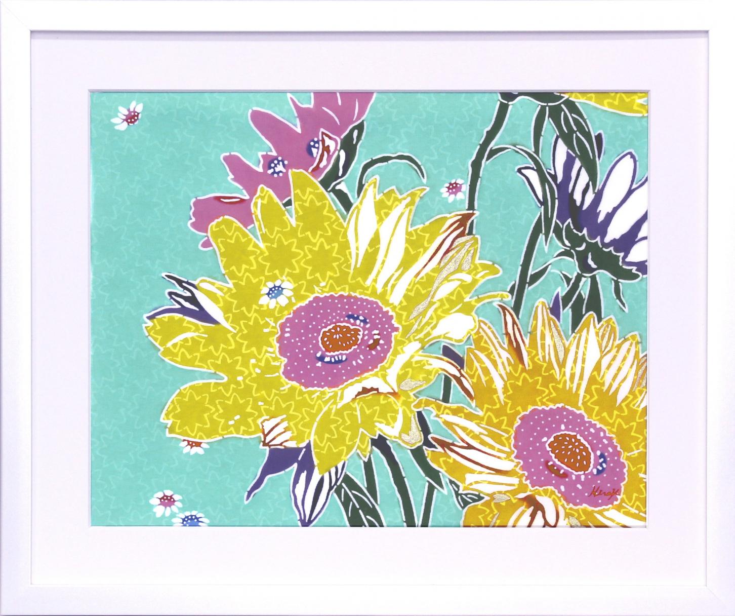太陽光の眩しさや揺らぎを星型模様や花びらの一部を金色で染めることで表現し、奥のひまわりをピンク色、白色で染めることにより遠近感も出ています。金城氏の確かな古典技法の技術力と情熱から生まれた作品です。
