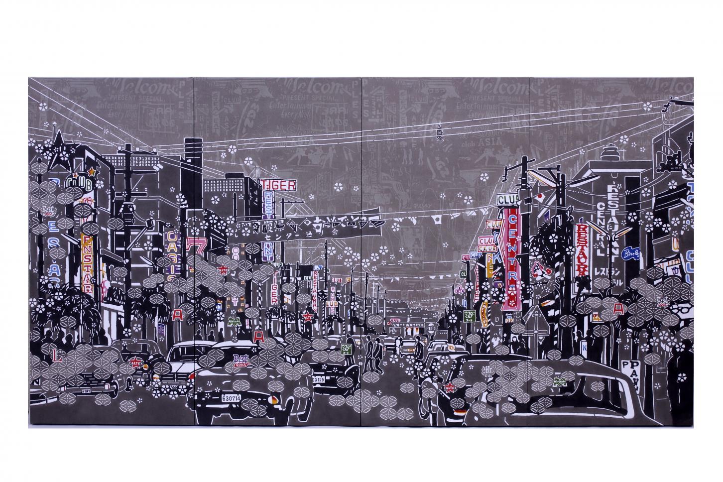 右側を走る車や色とりどりのネオンが輝き、ゲート通りと並ぶ歓楽街。古典模様の七宝繋やAサインマーク、また電線にコウモリも描かれています。