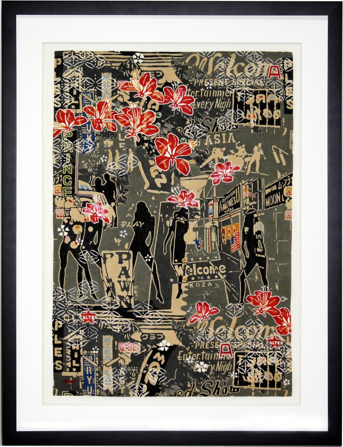 コザゲート通りは、米軍嘉手納の出入り口起点とする通りで、コザの表玄関。70年代から80年代にかけては外国人相手にショーパブが多く営業。色とりどりの看板と、そこに記されている横文字を紅型に取り入れ、見事に染め上げた作品。