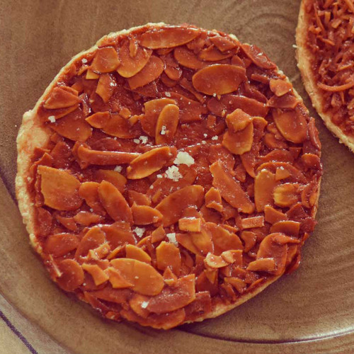 近くにある老舗の煎餅店の塩せんべいをベースに、フランスの焼き菓子である「フロランタン」風にしあげてあります。ぐつぐつ煮たバターとハチミツに、アーモンド(アマンド)とココナッツ(ココ)の2種のナッツをのせ、フランス・ブルターニュ地方のゲランドの塩をまぶしてあります。