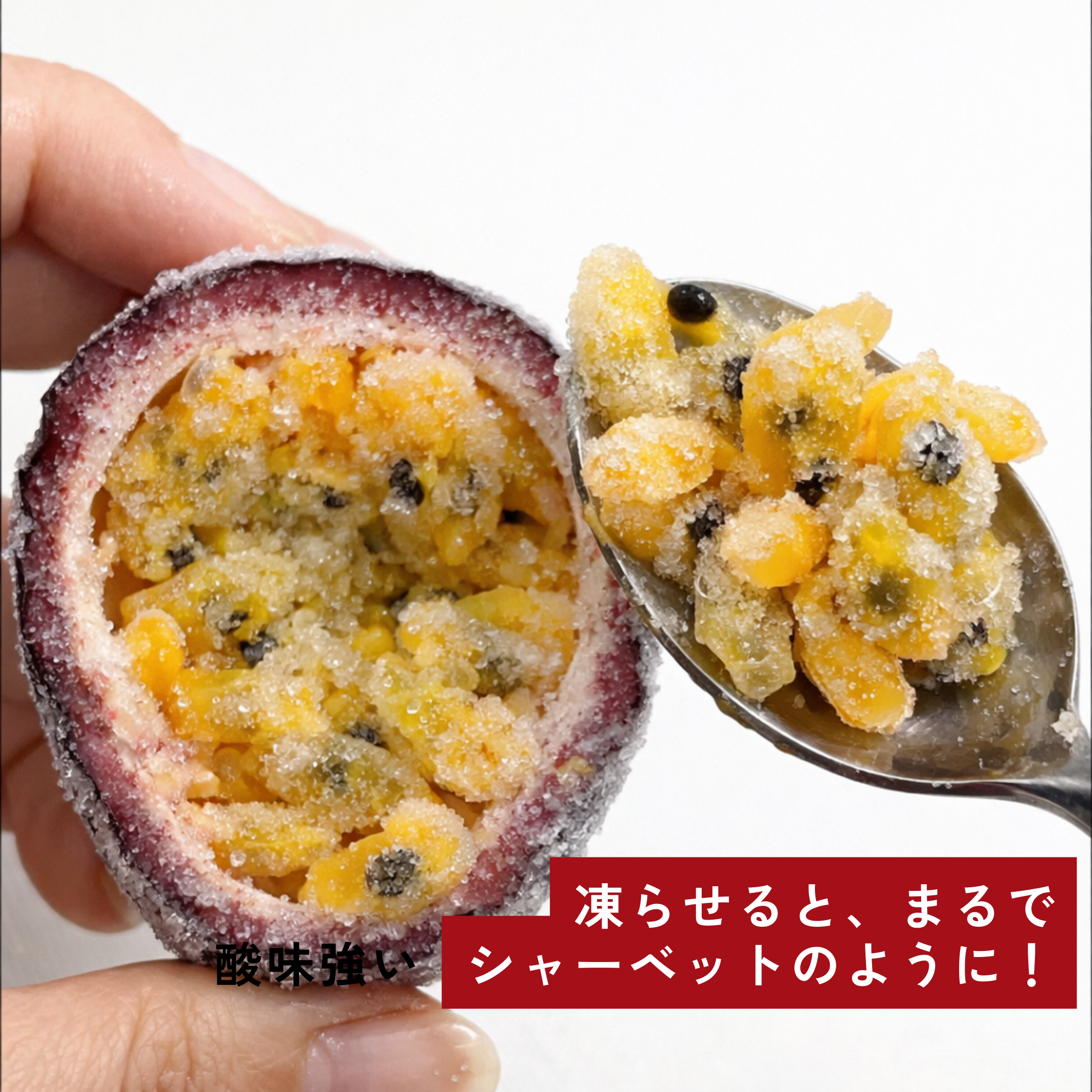 パッションフルーツはゼリー状の果肉と一緒に種もお召し上がり頂くことができます。