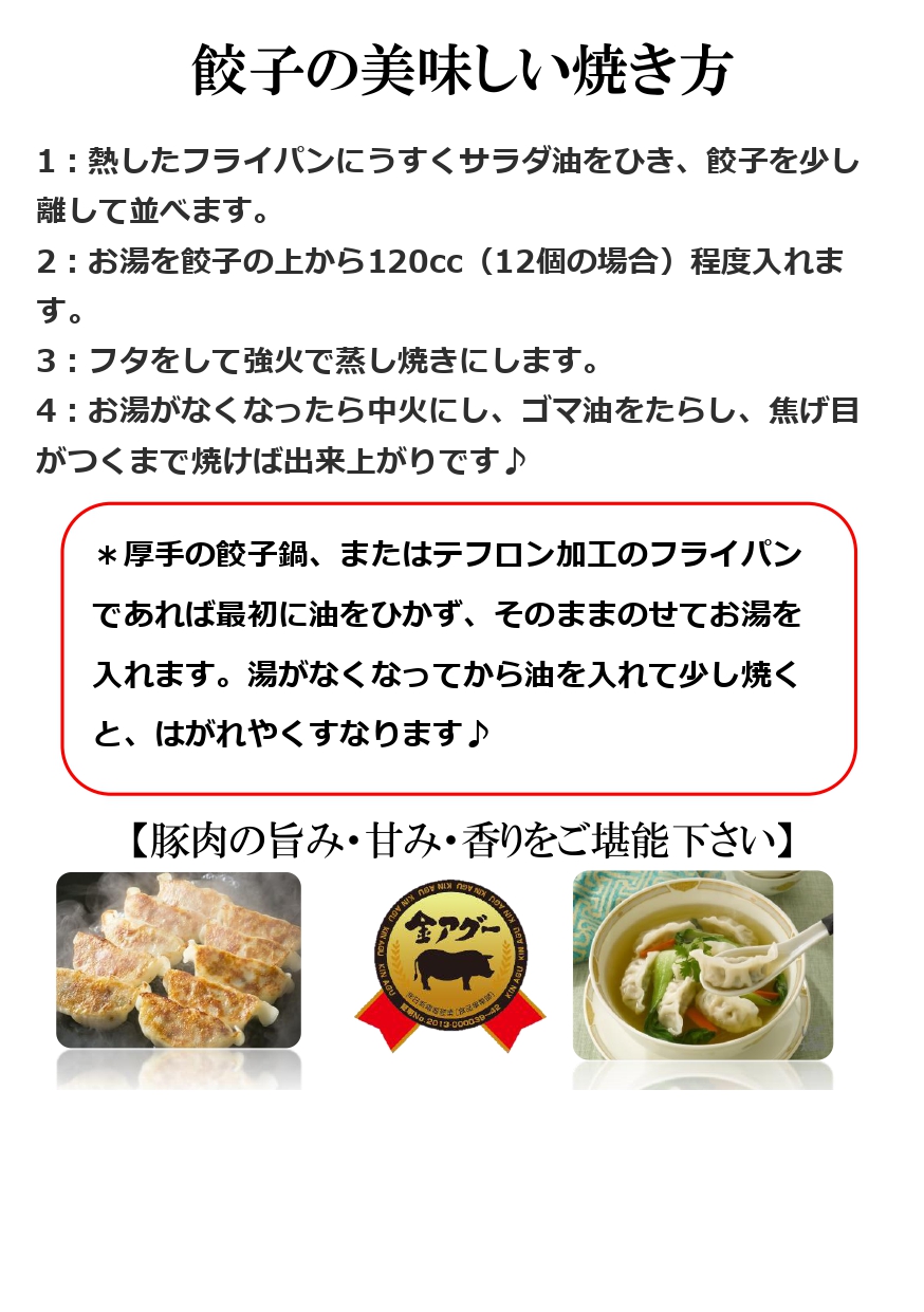 野菜(キャベツ、たまねぎ、白菜、にんにく、にら、生姜)、豚肉(県産)、醤油、食塩、調合ごま油、香辛料、皮(小麦粉、食塩)/増粘剤(加工でんぷん)、調味料(アミノ酸)、トレハロース、酒精、(一部に小麦・大豆・ごま・豚肉を含む)