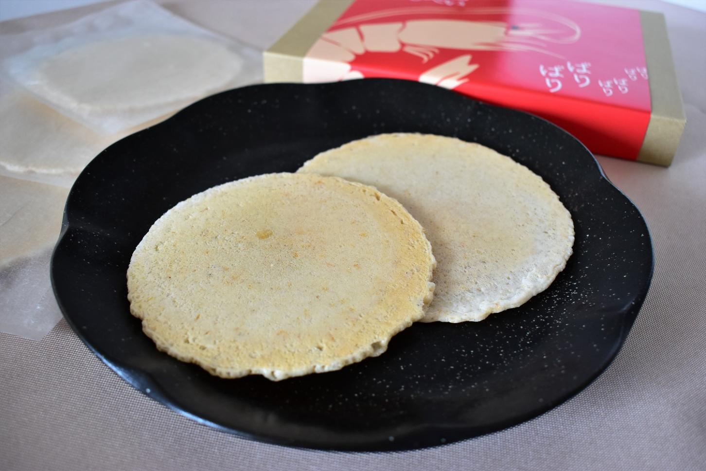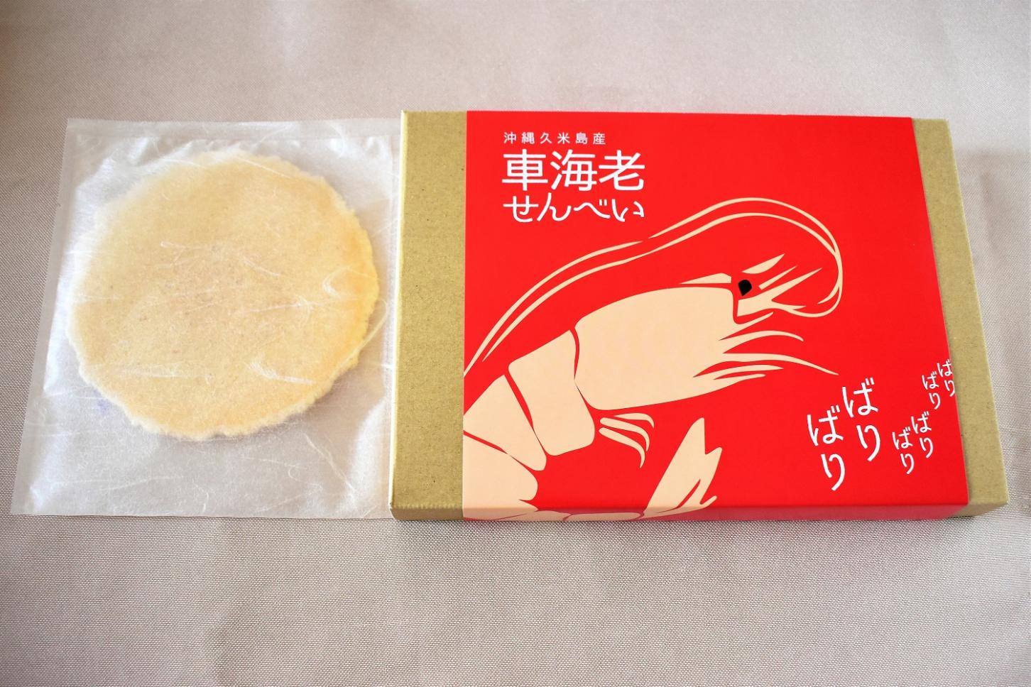 車海老の豊かな風味と、歯ごたえのある食感が自慢。「車海老せんべい」の車海老は、養殖の拠点産地に認定されている、美しい海が広がる久米島で育てられています。