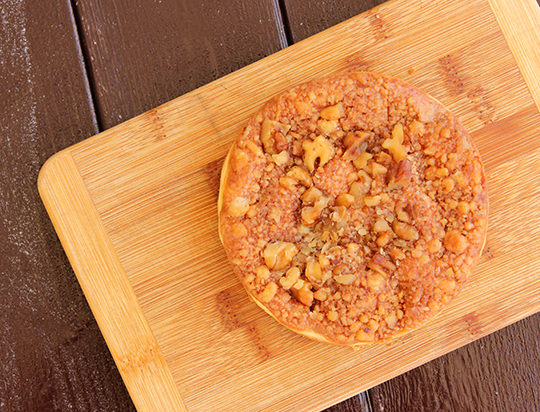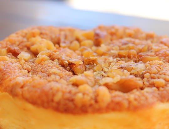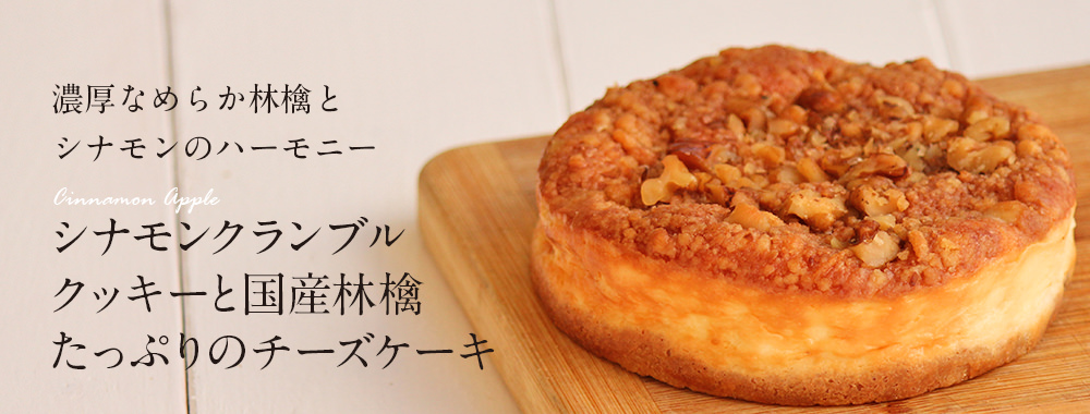 国産林檎をたっぷり使用し、ケーキの上にクルミとシナモン入りのクランブルを使用して香ばしいチーズケーキに仕上げました。