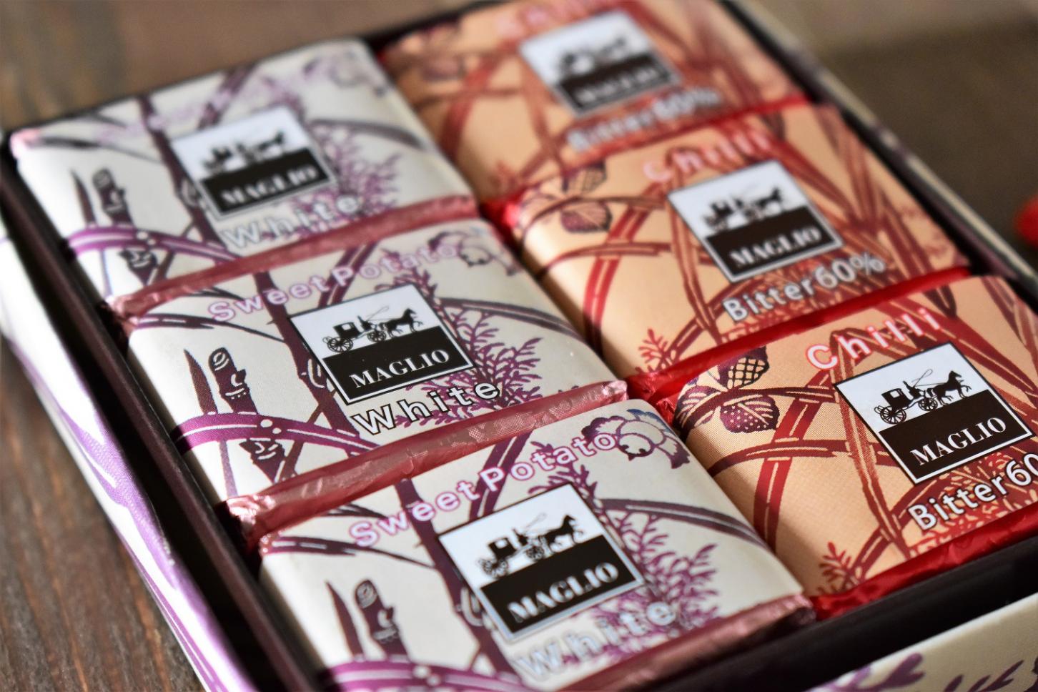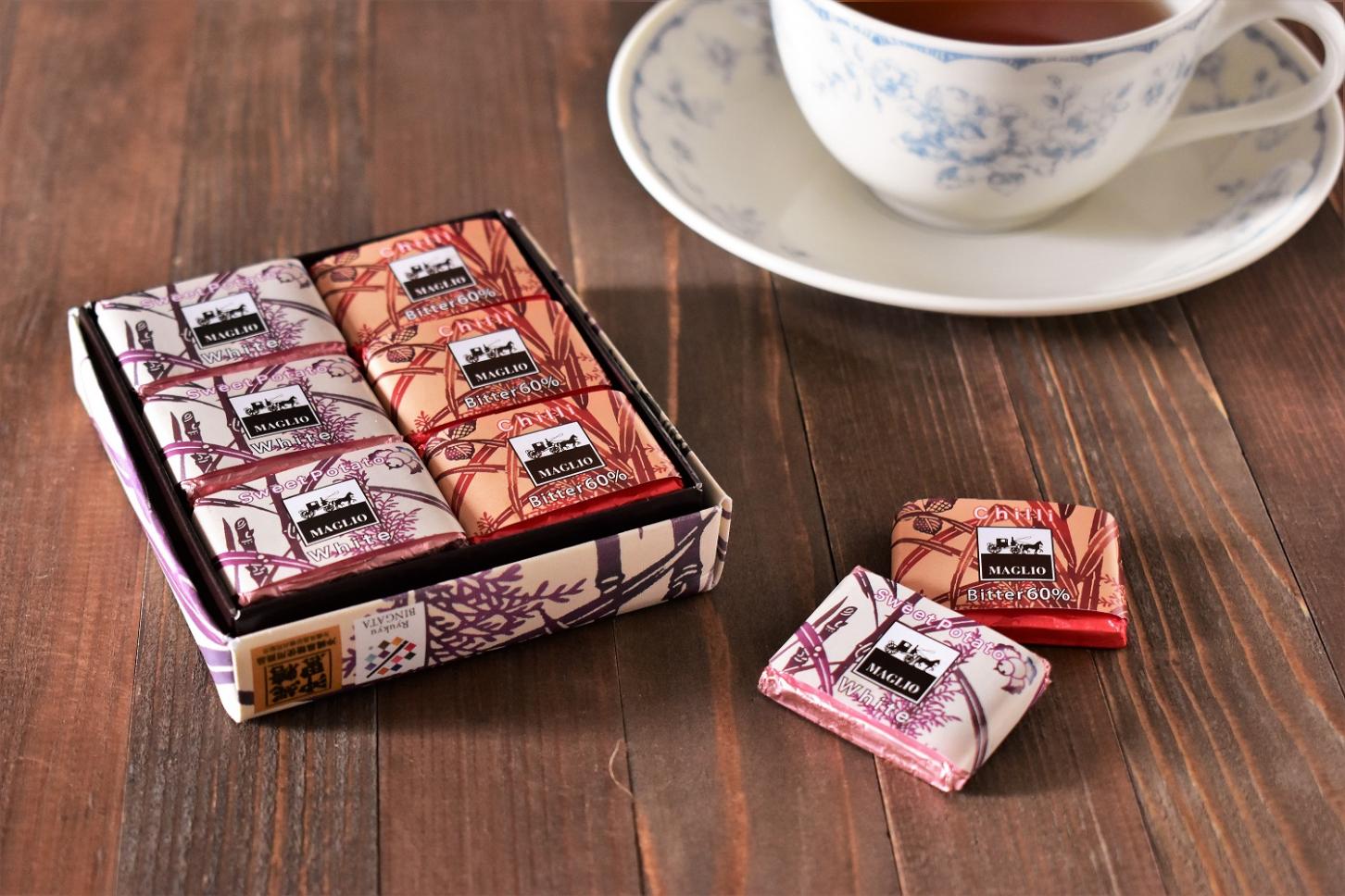ホワイトチョコレートと紅芋フレーバ、島唐辛子フレーバーチョコレート、それぞれ6枚入りです。