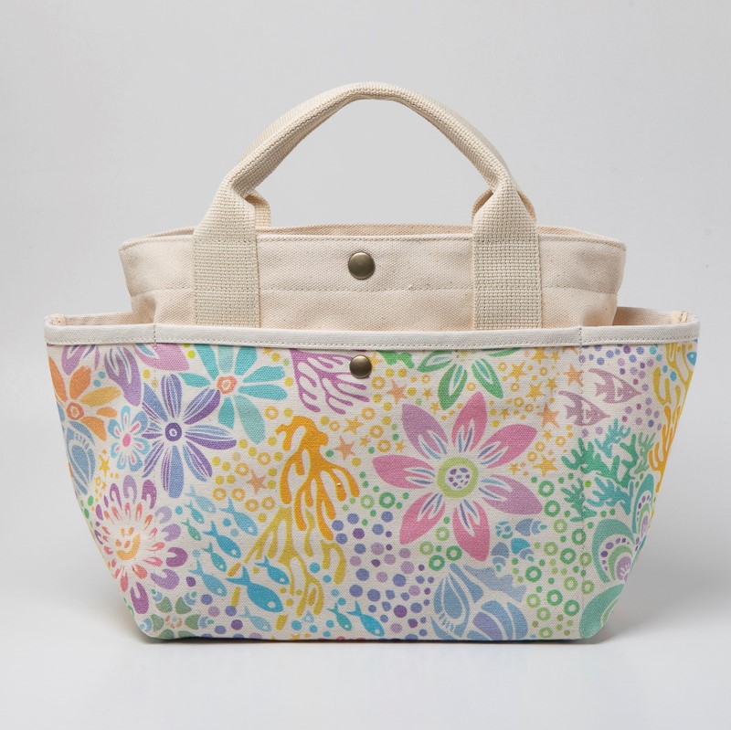 ちょっとしたお出かけにぴったりの使い勝手のいいサイズで、外側には沖縄を代表するイラストレーター・pokke104(池城由紀乃)さんの作品がプリントされています。