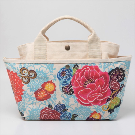 外側と内側に多数のポケットがあり、丈夫さと機能性を兼ね備えたハンドバッグ。ちょっとしたお出かけにぴったりの使い勝手のいいサイズで、外側には沖縄を代表する若手紅型作家・新垣優香さんの色鮮やかな作品がプリントされています。