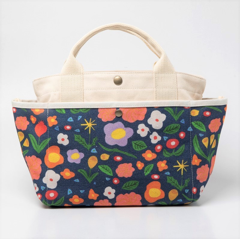 外側と内側に多数のポケットがあり、丈夫さと機能性を兼ね備えたハンドバッグ。ちょっとしたお出かけにぴったりの使い勝手のいいサイズで、外側には沖縄の人気イラストレーター・MIREI(金城美玲)さんのかわいい作品がプリントされています。