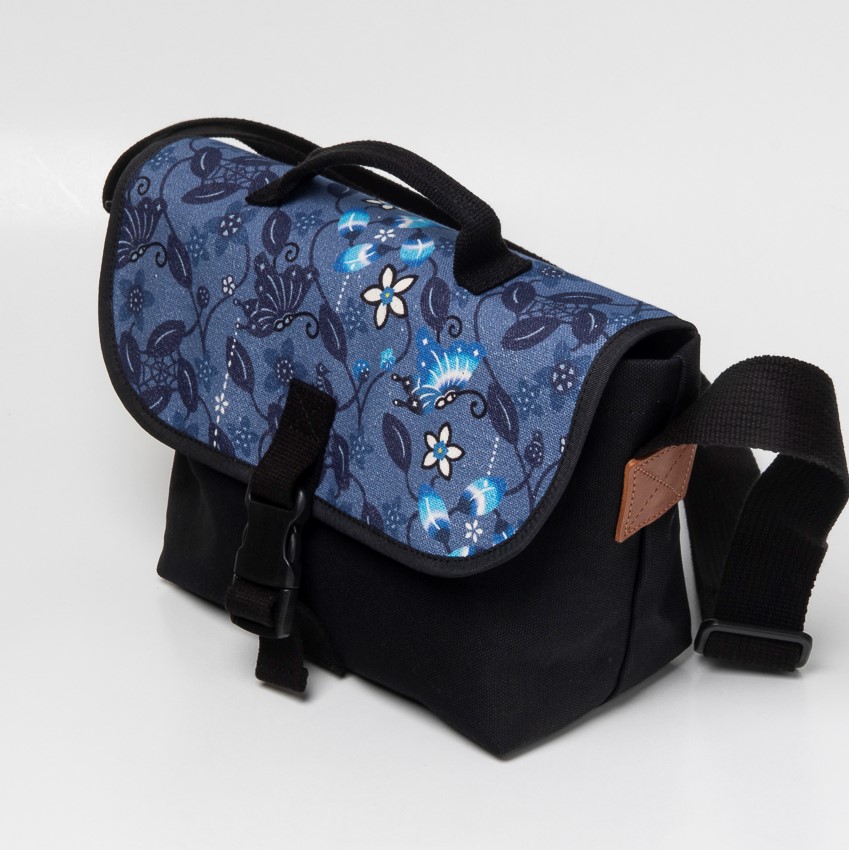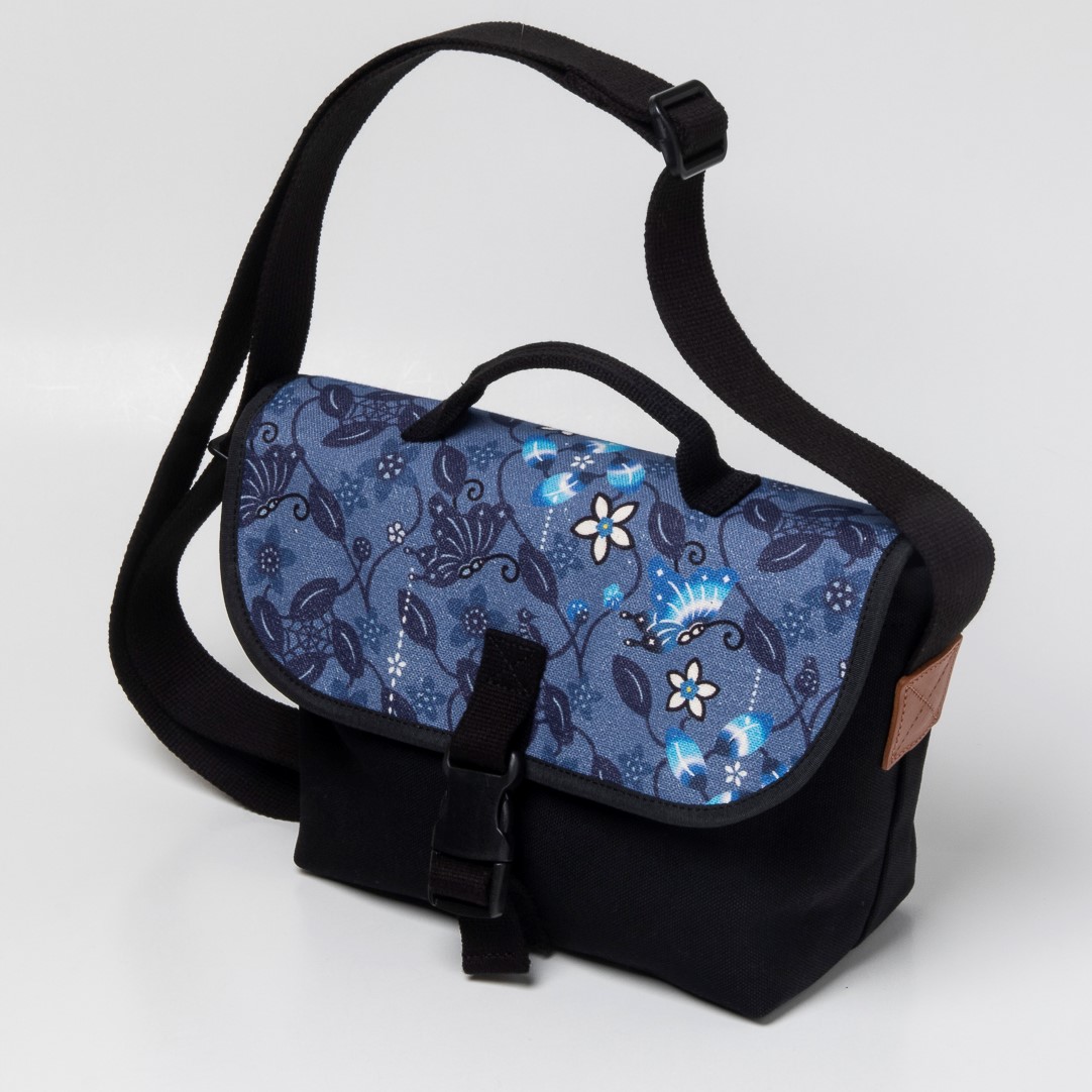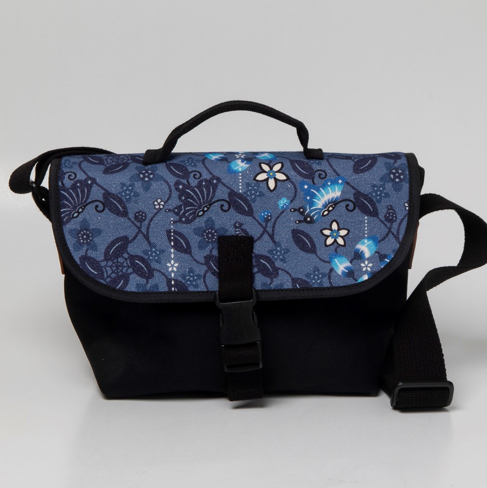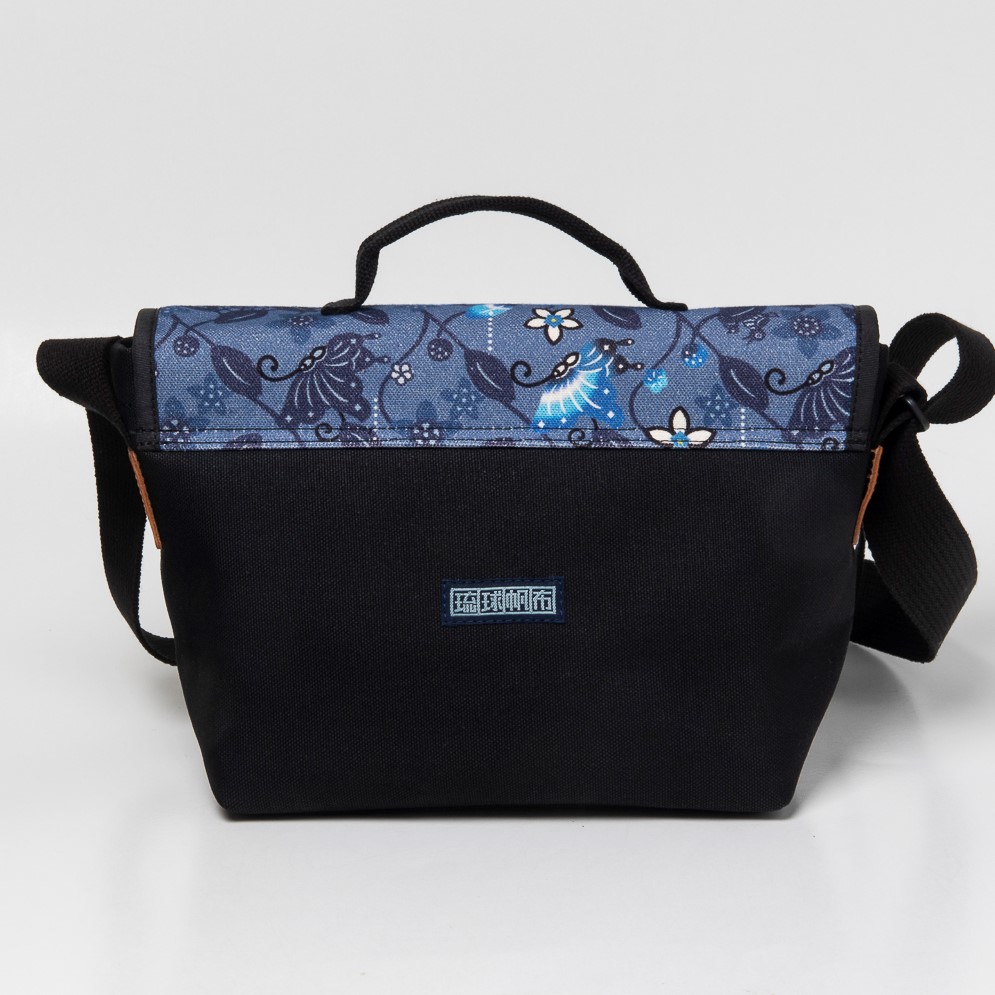 手持ち、肩掛けと2ウェイで使用できるメッセンジャ-バッグ。ちょっとしたお出かけにちょうどいいサイズで、前面のフラップには、沖縄を代表する人気紅型作家・宮城守男さんの独創性あふれる作品がプリントされています。