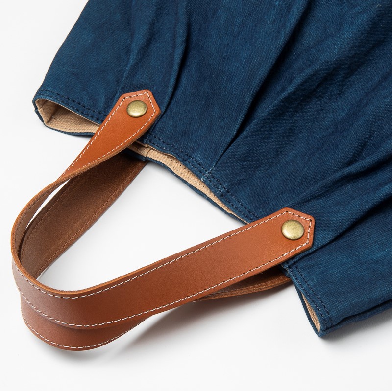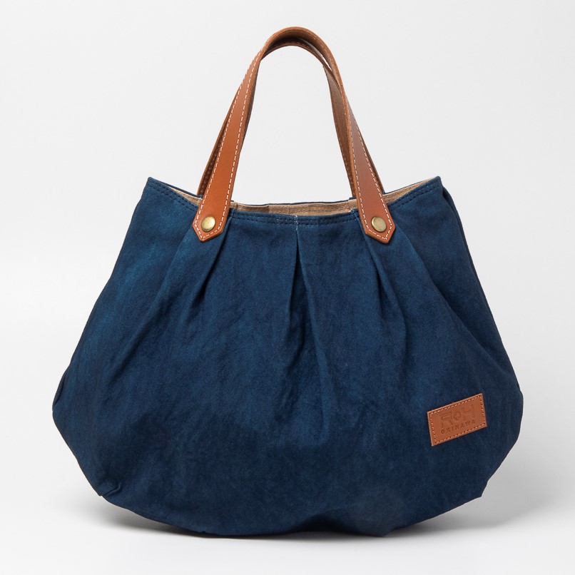 沖縄の伝統的な染色技術で染めた、11号帆布で作ったパンプキンバッグ。本染めならではの深みのある藍色が魅力で、経年変化を楽しみながら使うのもおすすめ。