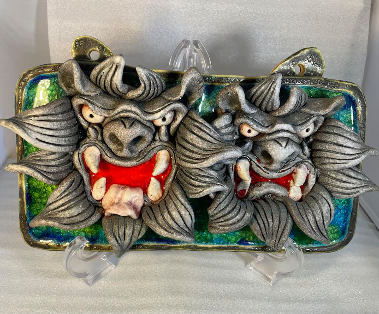 陶板を土台にした面シーサーに沖縄の海を想像するかの様に琉球ガラスを敷詰め口中には赤ガラスを入れて焼成。