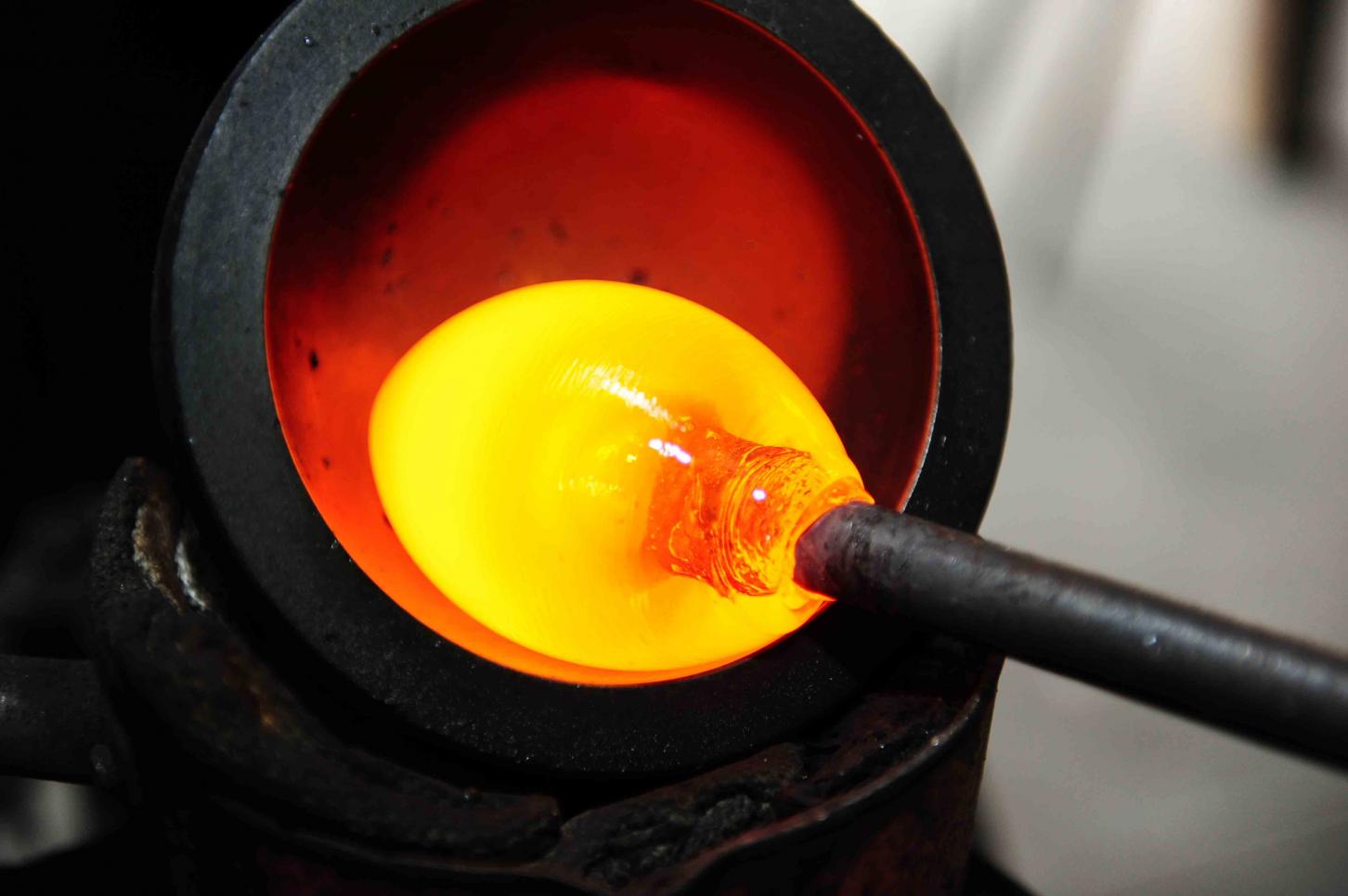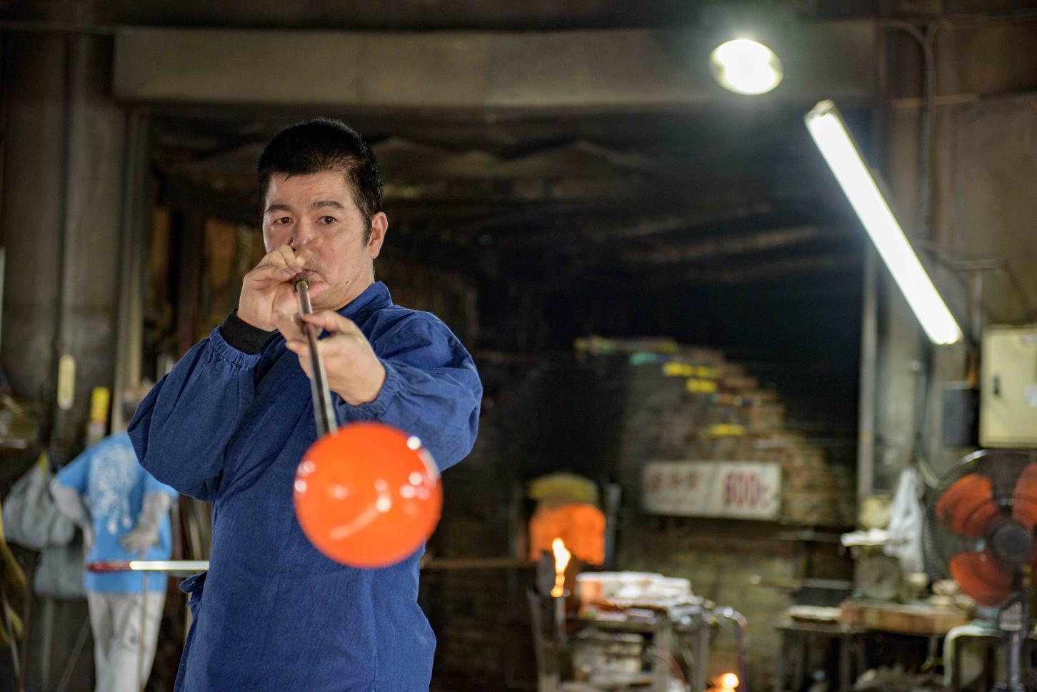 その中にある『糸満硝子製作所』は現代の名工が4名、沖縄工芸士が15名と県内で最も多く匠を輩出しており、職人たちは1300℃の窯から出る熱風の中、溶けたガラスに息吹を与えます。