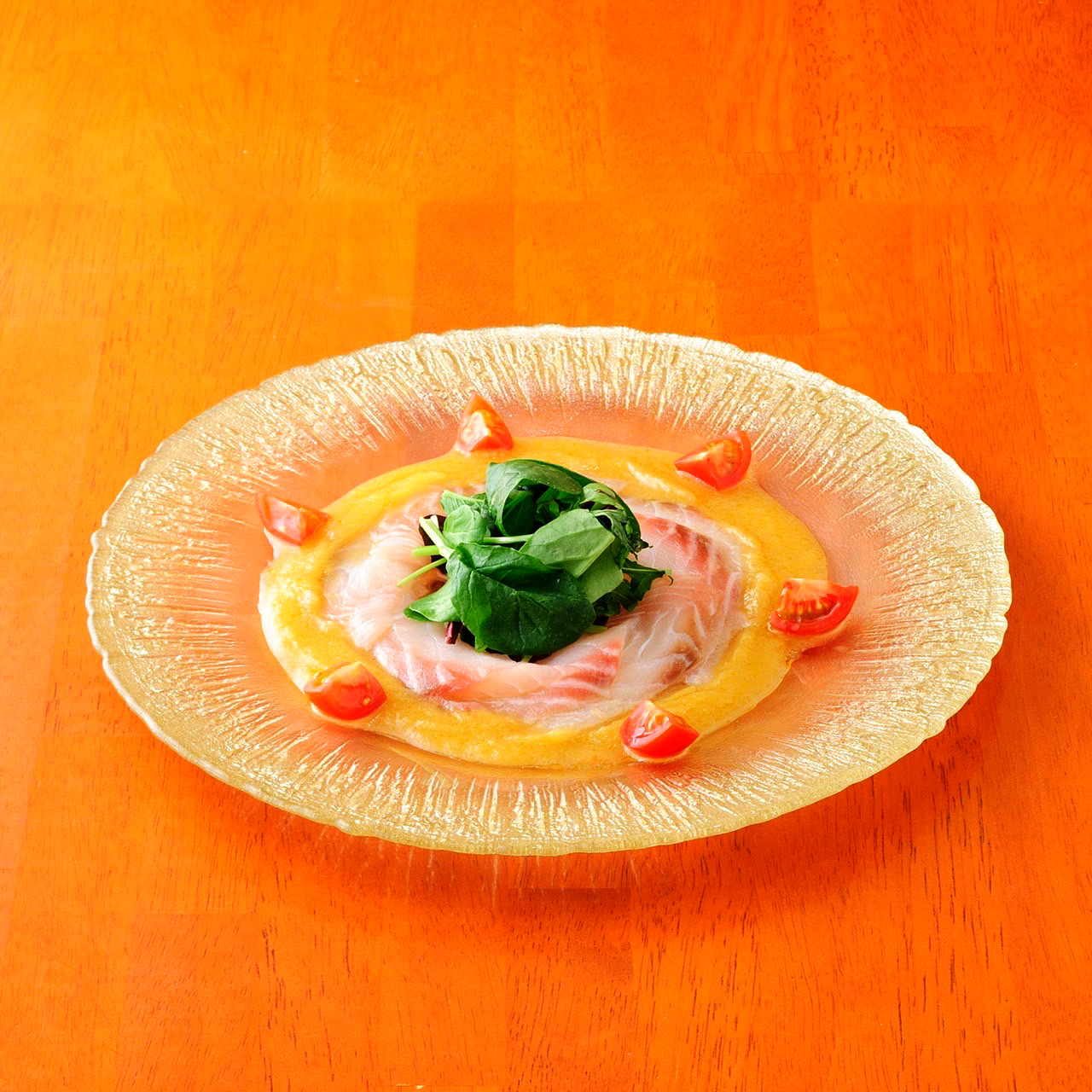 黄色に輝く沖縄県産の金美人参と、マンゴーの味わいと風味を活かしたままペースト状にして閉じ込めました。まろやかな甘味と深い味わいを醸し出す贅沢なドレッシングです。