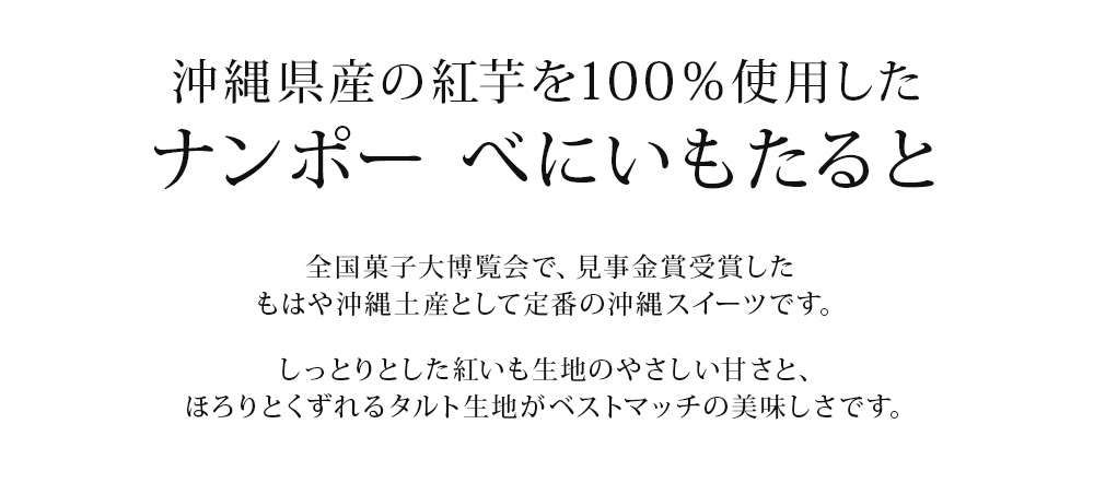 紅芋(沖縄県産)、小麦粉、砂糖、マーガリン、白生餡、鶏卵、麦芽糖、還元水飴、アーモンド、食塩、甘味料(ソルビトール)。クロレラエキス、乳化剤、香料、グリシン、酸化防止剤(V.E)、着色料(カロチン)、(原材料の一部に乳・大豆を含む)