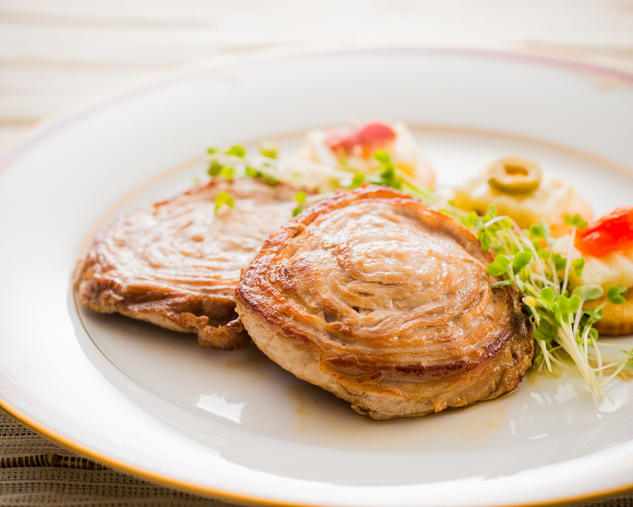 あぐーロールステーキは、厳選されたあぐー豚のモモ肉を薄くスライスして丁寧に丸めてステーキにしています。