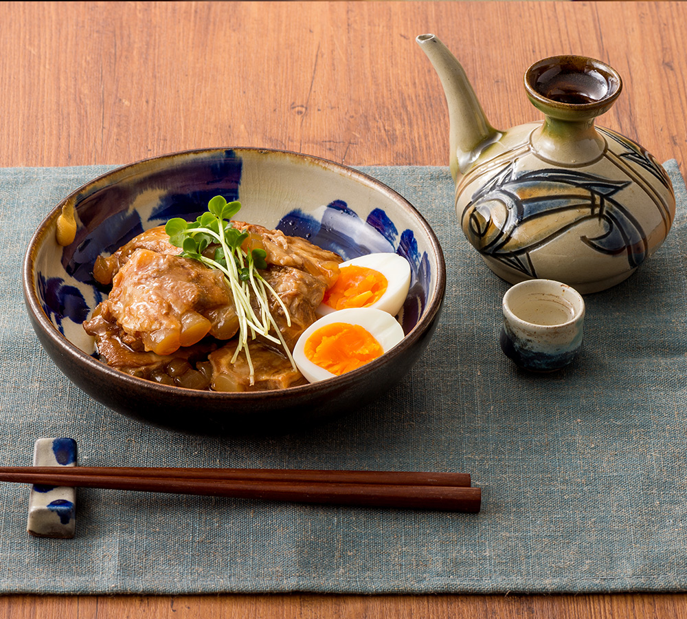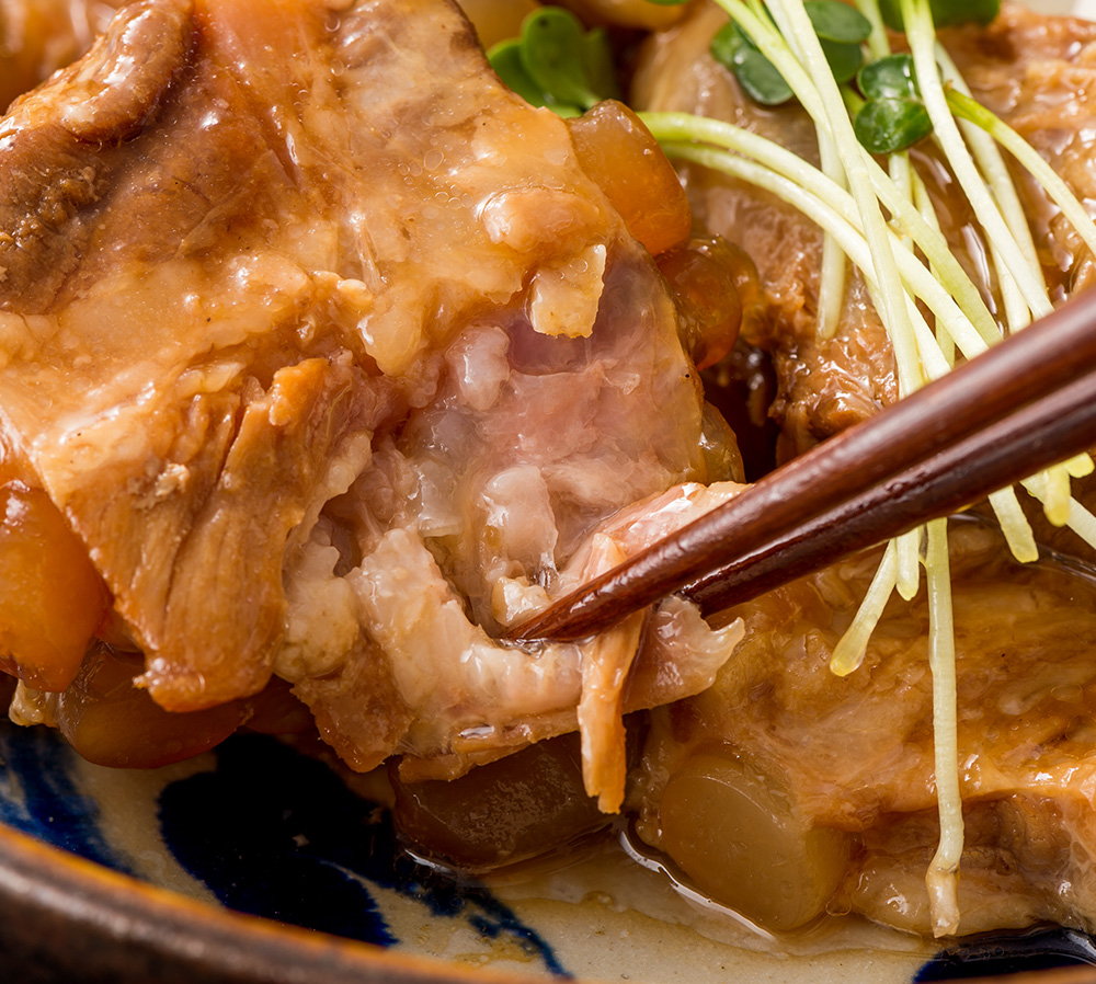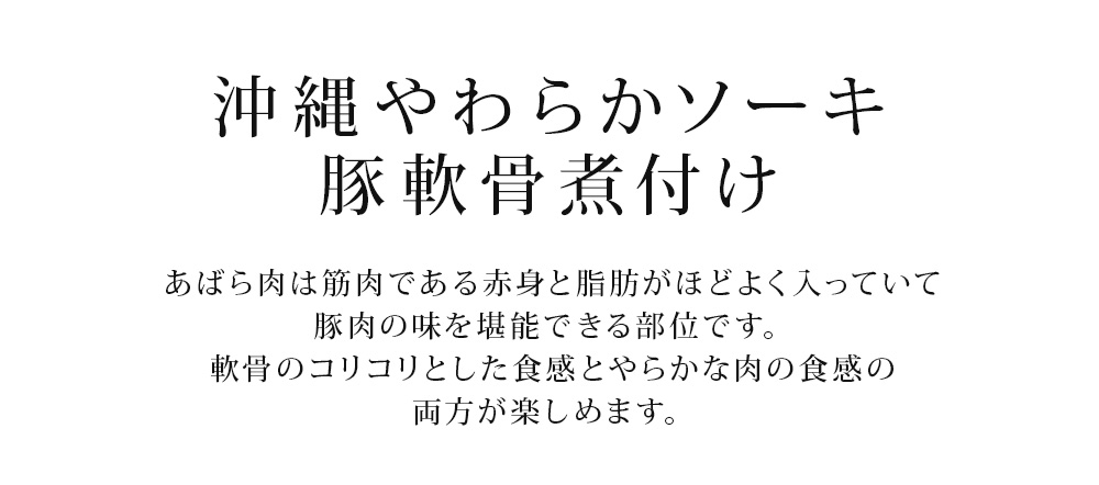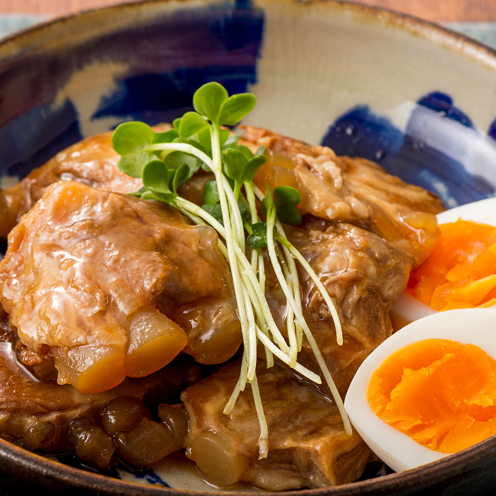 豚肉(軟骨つき)、砂糖(上白糖、黒砂糖)、しょうゆ、清酒、風味原料(鰹エキス、昆布エキス、生姜)、みりん、でん粉、泡盛、香辛料、調味料(アミノ酸)、カラメル色素、酸化防止剤(ビタミンC)、(原材料の一部に小麦、大豆を含む)